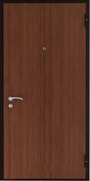 Ламинат - это доска из ДВП толщиной 4-5 мм с четырехслойным покрытием. Визуально он не отличается от натуральной древесины. Рисунок ламинированной доски может быть гладким и имитировать древесный спил или рельефным, имитирующим структуру дерева. Разнообразная цветовая гамма этого материала позволяет изготовить дверь, которая будет отлично смотреться в интерьере как квартиры, так и офиса.